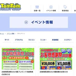 日本最大級の総合ホビー専門店「HOBBY SHOP TamTam」では、ホビー券が当たるタムタム会員様限定イベント「お客様感謝祭」や、さまざまなイベントを定期的に開催しています。詳細はTamTam(タムタム)のホームページをご覧ください。