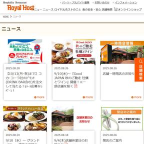 ファミリーレストランチェーン「ロイヤルホスト(Royal Host)」のホームページには、レシートで応募するドリンクバーキャンペーンや、キャッシュレス決済連携キャンペーン、マイロイヤルアプリやLINE公式アカウントでクーポンが貰える企画など、お得な情報が掲載されています。
