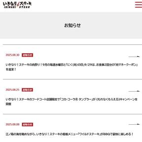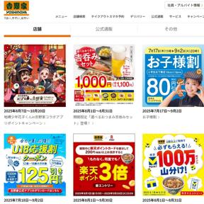 日本を代表する牛丼チェーン店のひとつである吉野家のWebサイトには、公式アプリやLINE登録でお得な特典が当たる企画や、キャッシュレス&ポイントキャンペーンなど、店舗と通販にて実施しているさまざまなキャンペーン情報が掲載されています。