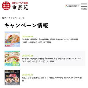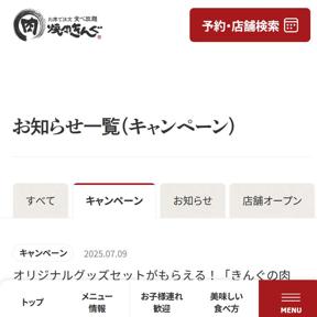 物語コーポレーションが運営する焼肉食べ放題チェーン店「焼肉きんぐ」のWebサイトで、オリジナルグッズが貰えるキャンペーンや、指定金額以上のお会計ごとに抽選券が公式アプリで配布される企画等が案内されていることがあります。