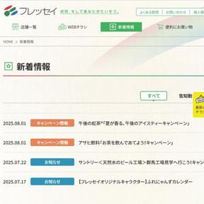 群馬県を中心に展開するスーパー「フレッセイ」のWEBサイトには、フレッセイポイントが当たるキャンペーンや、フレッセイ各店でお買上げいただいたレシートで応募できるキャンペーンなどが掲載されています。