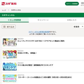 大手ドラッグストアチェーン「スギ薬局」のWebページ「スギチャンネル」には、指定商品ご購入での返金キャンペーンや、各種のイベント、豪華賞品が当たるクローズド懸賞などが掲載されています。