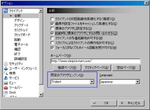 IE互換機能を搭載したブラウザ「Sleipnir」の場合は、既定のブラウザエンジンに「Trident」を設定することにより懸賞当確をご使用いただくことができます。設定方法はメニューから「ツール」−>「Sleipnir オプション」を選択し、オプション画面を表示させます。オプション画面に既定のブラウザエンジンという項目がありますので、「Trident」を選択します。